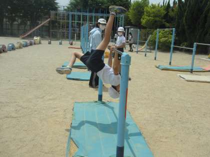 鉄棒の学習が始まりました。逆上がりができるようになりたいと,まめができても練習に取り組む子どもたちです。豚の丸焼きじゃんけんも大喜びでした。