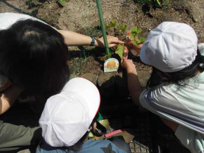 さつまいも,ナス,キュウリ,トマト,メロンの苗を畑に植えています。大きくなってきているかな?とものさしで苗の長さを測り,よく見て観察しました。触り比べてみて,手触りが種類によって違うことに気が付きました。タブレットで写真も撮っておきました。これからの成長が楽しみです。