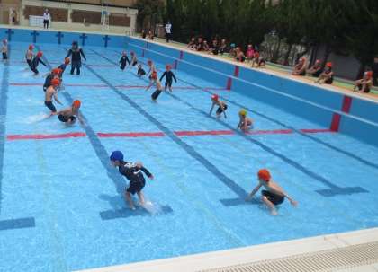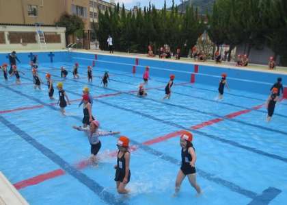 プールでは,水の中を歩いて真ん中まで行きプールの底にタッチ。少し水が冷たかったですが,みんなとても楽しそうでした。