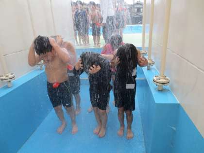 小学校に入学して初めての「みずあそび」でした。水着への着替え方や腰洗い槽の入り方,シャワーのかかり方,プールサイドでの並び方などを教えてもらいました。