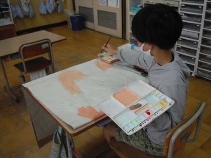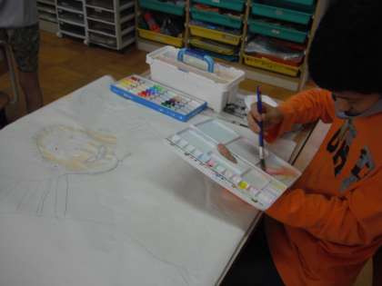 下書きをした等身大の自分に絵の具で色をつけています。自分の肌の色に似るように混色して色を作りました。仕上がりが楽しみです。