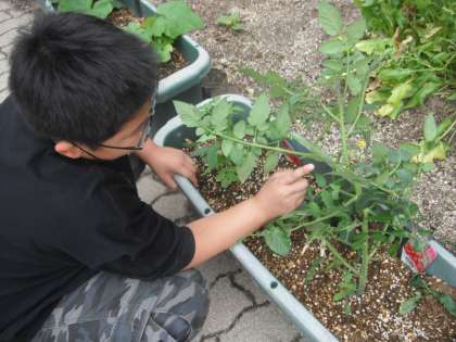 ミニトマトを観察していると,小さな実がなっていることを発見!!「かわいいなぁ。」とうっとり眺めていました。大きくなって食べごろになるのが楽しみですね。