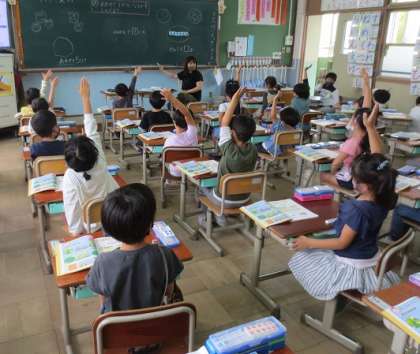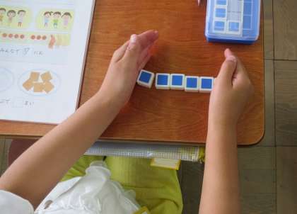 左と右のブロックを両手で寄せて,ぜんぶでいくつになるかを確かめました。たし算の意味がわかったかな?