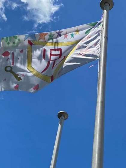 澄み渡った青空のもと,子ども達はフライングディスクゴルフを行っています。