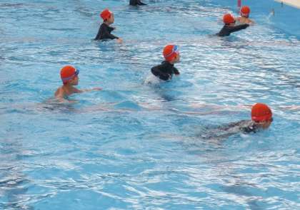 今日は今年最後の水あそびでした。今まで学習した「カニあるき」「あひるあるき」「わにあるき」などをしながら、水に顔をつけて進む練習をしました。時間の最後には、3人チームで水の中を走るリレーをしました。