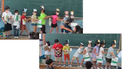 かぶを引っぱるときには動作をつけて、「うんとこしょ どっこいしょ」と声をそろえて言うことができました。