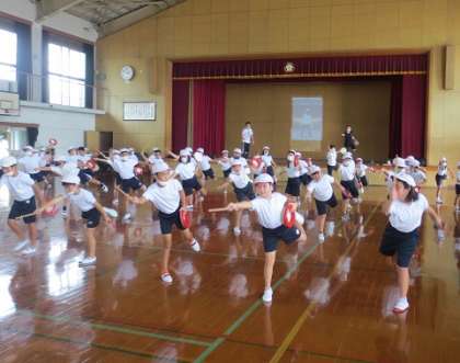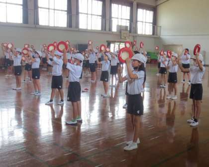 スポーツデーに向けて、「エイサー」の練習が始まりました。「バーランクー」と呼ばれる太鼓をバチで叩きながら音楽に合わせて踊ります。バーランクーの音がそろっていて、みんなが息のあった踊りができていることがわかりました。