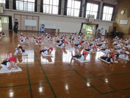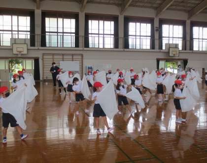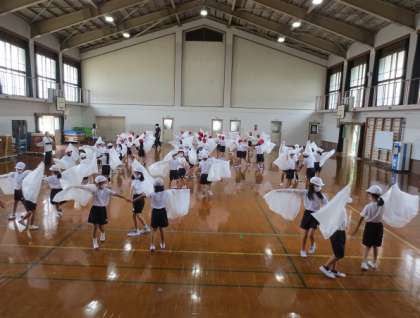 2年生が団体演技「ONO×FAMILY」の練習をしていました。白いビニール袋を使った演技のようです。どんな演技になるのか楽しみです。