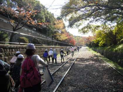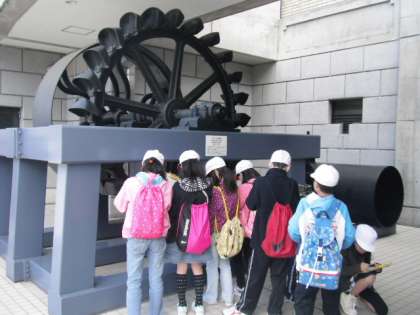 琵琶湖疎水記念館に行って見学した後、実際に疎水沿いを歩きました。田邉朔朗博士銅像や水路閣も見に行きました。記念館では、水車の大きさにびっくりしたり、資料を見て当時の人々の苦労を知ったり思ったことをそれぞれが一生懸命書き込んでいました。