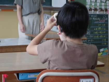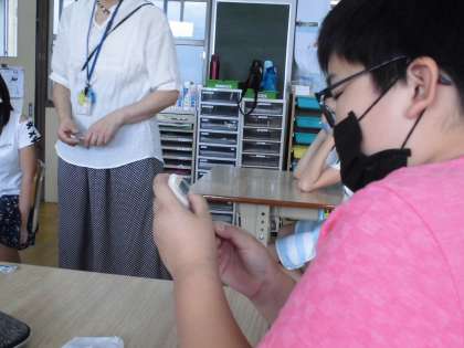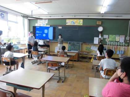 「小学生への環境学習事業」の取組で、体温計を販売されている企業の方にお越しいただき、体温のしくみについての授業をしてもらいました。正しい体温の測り方を教えてもらったり、時間によって体温は変化することなどを教えてもらいました。わかりやすい説明に興味深々の子どもたちでした。これからも正しく体温を測り、健康管理に努めましょうね。