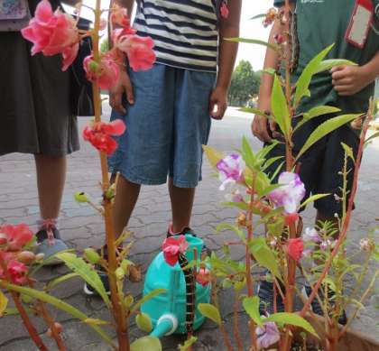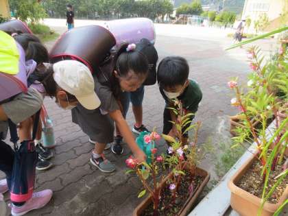 朝休みにホウセンカを見ている子どもたちがいました。ホウセンカを観察しているのかと思ったら、ホウセンカについている大きな幼虫の様子を見ていたようです。