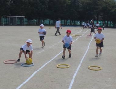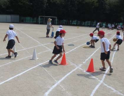 スポーツデーの個人競技「バラエティ走」の練習をしました。バラエティ走では、輪っかをくぐったり、ボールを運んだり、コーンの周りを回ったりして、最後にポーズを決めてゴールします。