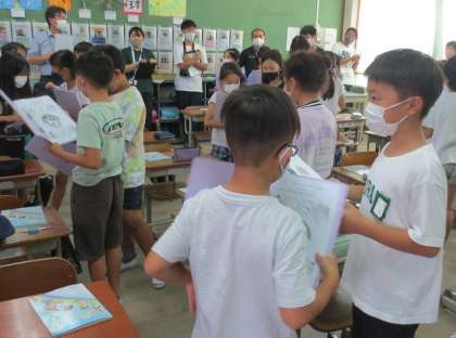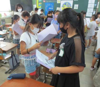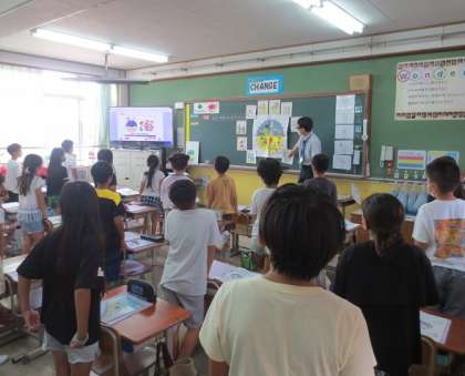起きる時刻、朝食の時刻、宿題の時刻、寝る時刻を英語で尋ね合う表現に慣れ親しみました。相手の時刻を聞いた後、"Really?" "Me,too." "Wow!"などの相づちを動きをつけてするペアもあり、交流をとても楽しんでいました。