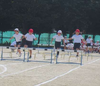 2年のバラエティー走はハードルをくぐったり、コーンの周りを回ったり、ポートボール台からジャンプしたりしました。全力で頑張りましたね。