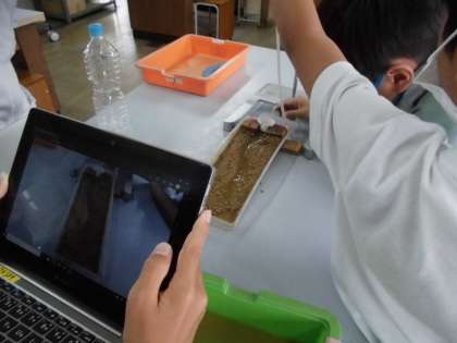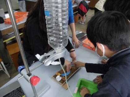 作った川に水を流すと、川の周りの土地がどうなるのか、また流す量を増やすとどうなるのかを班ごとに実験しました。