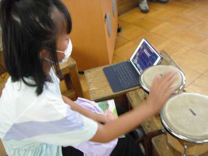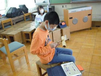 好きな打楽器を選んで、大きさを工夫して音楽作りをしました。タブレットで譜面を作り、録音しました。次の時間はそれぞれが作った音楽を交流するので楽しみです。