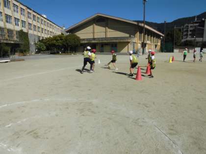 しかしよく見ると、同じ色のゼッケンを着ているのに帽子の色が違う子がいる、コートの中ほどにゴールがある・・・