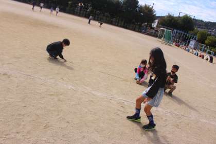 運動場に出て、グループで相談しながら、