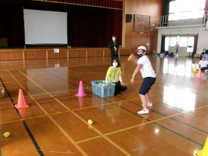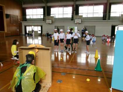 プログラム3番は、「たまごわりリレー」でした。スタートからたまごの的まで走り、的当てをします。的に当たったら次の人にバトンタッチです。全員が的に当てることができると、なんと!!ひよこになった校長先生が生まれましたよ!みんな大喜びです。