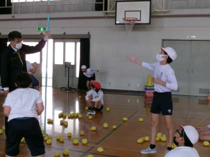 プログラム4番は「ダンシング玉入れ」です。玉入れの途中で音楽が変わると、手拍子をします。また笛の合図で玉入れがスタートです。たくさん玉が入ってうれしかったですね。