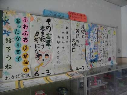 今日と25日(金)の参観に併せて、各学級で人権標語を考え、掲示しました。