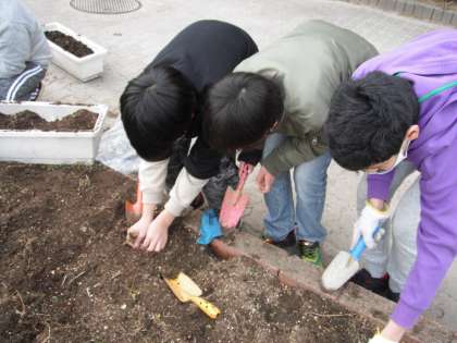 園芸委員会では、花壇の手入れに取り組みました。同じ委員会の友だちと協力して雑草を抜いて、きれいに土をならし、きれいに花壇を整えました。