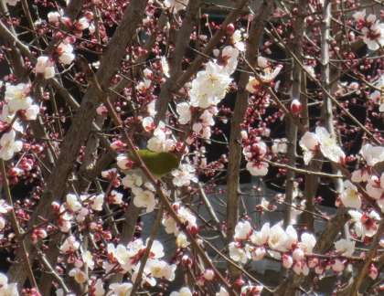 学校の大きな梅の花が咲き始めました。最近はめじろが遊びに来るようになりました。2年生の子どもたちは「かわいい。」「春はすてきだね。」と言いながら、めじろや梅の様子を教室から眺めています。
