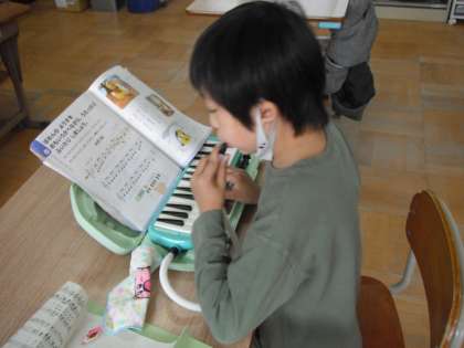 国歌や校歌の練習をした後、それぞれの学年に応じて鍵盤ハーモニカやリコーダーの演習に取り組みました。何度も繰り返し熱心に練習する姿が見られました。