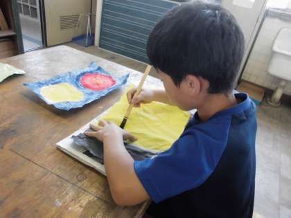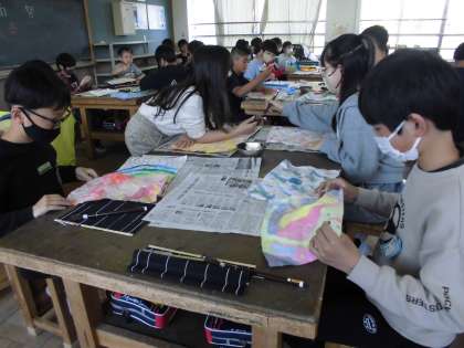6年生になって最初の図工の学習で、和紙に絵の具でそれぞれが自由に色をつけ、その和紙に自分の今の気持ちを表す漢字1字を習字の筆で書くという作品を作っています。和紙に素材と絵の具の色、それに墨が重なり、素敵な作品が完成しそうです。