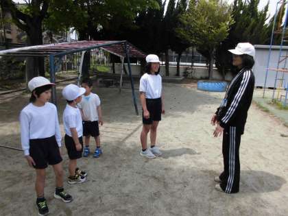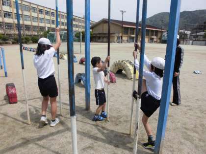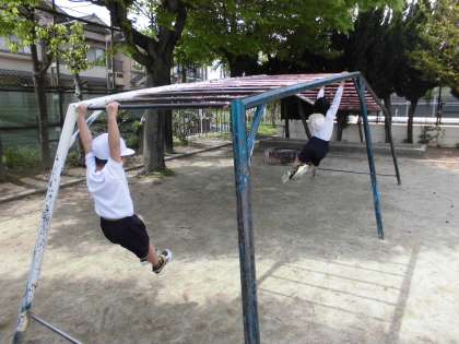 今日は、天気も良く外で過ごすには絶好の1日でした。4時間目に久しぶりの体育をしました。1年生にとっては初めての遊具。興味津々で取り組んでいました。