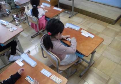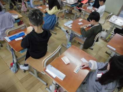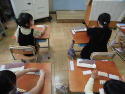 はじめは積み木みたいに積み重ねている子もいましたが、しっかりと話を聞くと横に並べていくことができました。