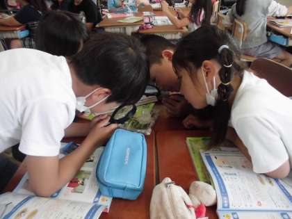 虫眼鏡を使って、アゲハの幼虫を観察してみました。ピントを合わせるのに苦労していましたが、「色がついてる!」「線みたいなものがある!」などと言いながら観察を楽しんでいました。