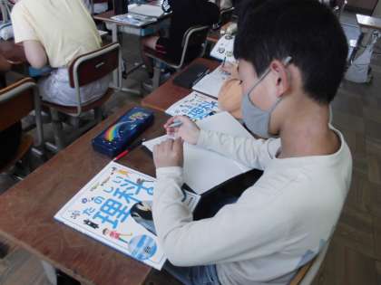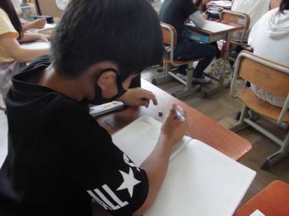 この勉強の1時間目ということで、今日はインゲンマメの種子の観察をしました。「おいしそう!」とか「恐竜の卵みたい!」などと言いながら細かく種子の様子を観察していました。