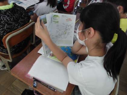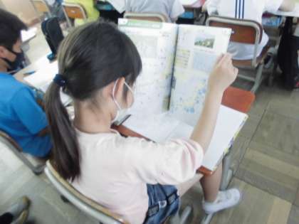 日本の国土について調べています。教科書や地図帳を駆使して学習を進めています。国土の特色を調べるのには地図帳がとても便利なので、これからは地図帳の使い方や見方もしっかり学んでいきたいです。