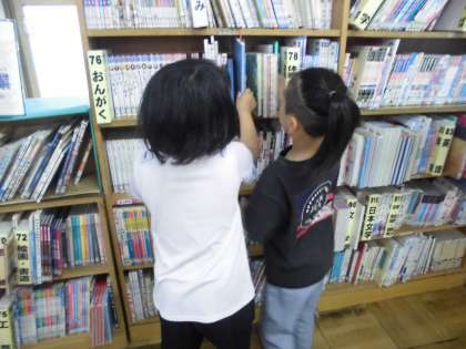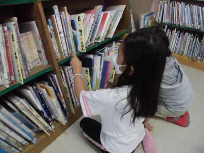 図書室でどこにどんな本が置いてあるのかを調べるために、カードに書かれている本をペアで探す本探しゲームをやりました。本の種類によっては見つけるのが難しい本もありましたが、少しずつ図書室のことが分かってきているようでした。