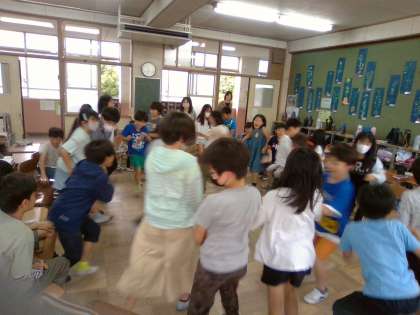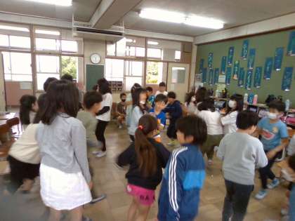 ボランティアの先生と仲良くなるために、中間休みに『学校にまつわる なんでもバスケット』をしました。途中、森先生がこっそり座っていて、鬼が2人になって「え?」「なんで?」となったので、全員で大笑いしていたところが、大変ほほえましかったです。
