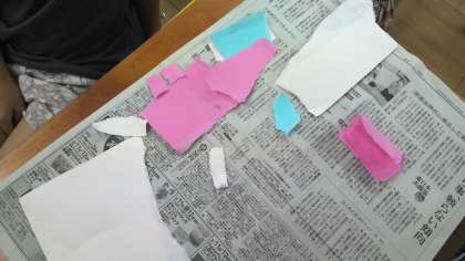 新聞紙や画用紙をちぎったり破ったりしていくと、いろいろな形がうまれてきます。