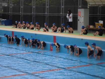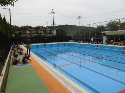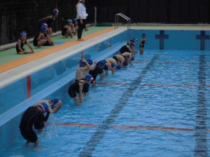 みんなすごく楽しみにしていたプールに初めて入りました。今日は、手をつけたり、顔や頭に水をかけたり、低水位でできる水慣れを楽しみました。少し肌寒かったですが、寒さを感じさせないほどのはしゃぎっぷりでした。