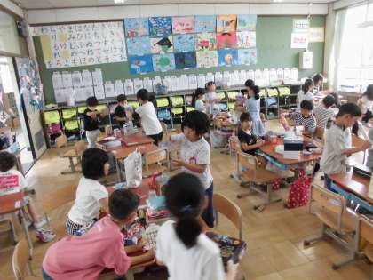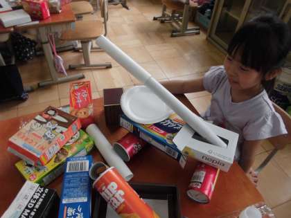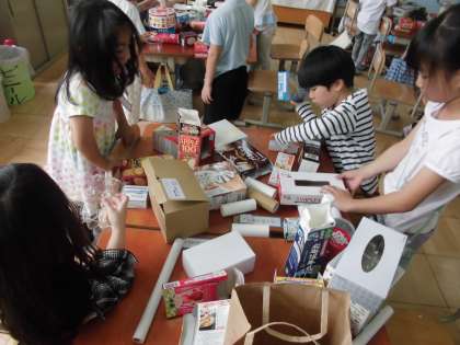 今日は、おうちから持ってきてくれたいろいろな箱や缶を使って、二人組やグループで様々な形を作りました。