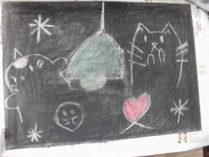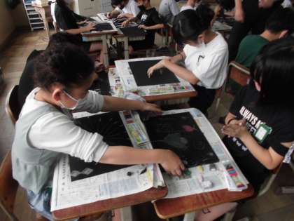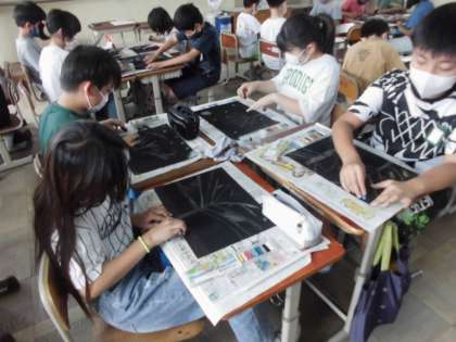 ご参観、ありがとうございました。コンテで真っ黒に塗った画用紙を消しゴムで消しながらデザインを描きました。手が真っ黒になりましたが、素敵な作品を仕上げることができました。