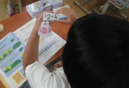 算数の学習でたしざんをしました。計算カードを使って繰り返し学習しています。最初は順番通りに、次はカードの順番をバラバラにして計算しています。ご家庭でもたくさん練習していると聞いています。ありがとうございます。