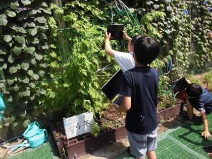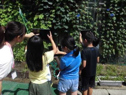 春に観察した生き物や植物がどのように成長しているかを観察しました。春の様子と比べてずいぶん成長していることがよく分かりました。今の様子をしっかりタブレットに保存しておきました。