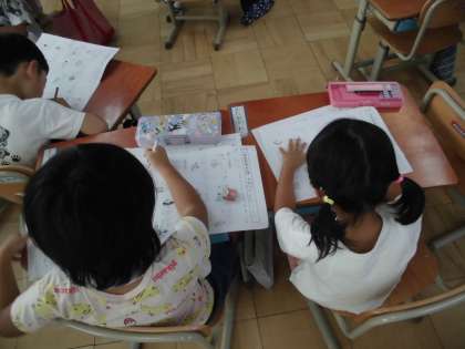 「友達と考えて書いてもいいよ」と言うと、それぞれに声を掛け合いながら机を移動し、「これって、●●やで」「ここ、何て書くん?」などと言いながらかたかなの言葉を書いていました。