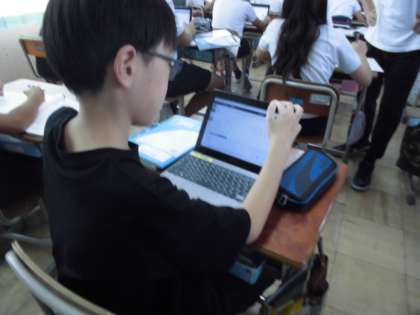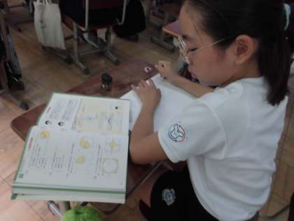 円の面積の学習をしました。練習問題を解き終わった後は、タブレットを使ってどんどん違う問題に取り組みました。繰り返しすることで身に付けていきたいです。