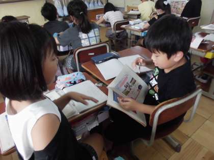 国語でポスターの読み方を学習しています。今日は、2つのポスターを見比べて違いを考えてみました。自分の気付いたことを近くの友だちと交流しながら深めていきました。