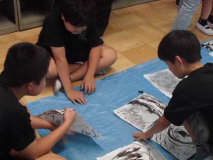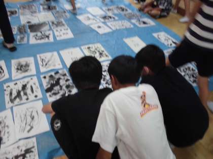 墨を使って作品を作りました。みんな手を真っ黒にしながらでしたが、意欲的に学習に取り組んでいました。できた作品は、みんなで交流しました。