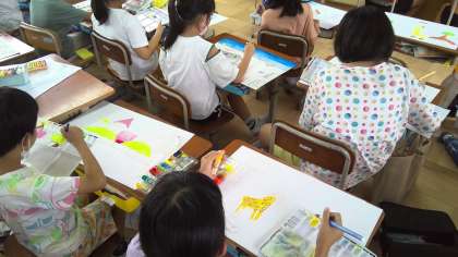 図工の学習でお話を聞いて想像して絵を描いています。