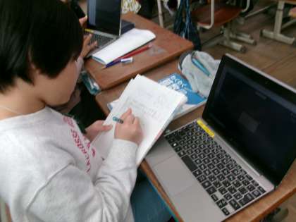三角形の面積の公式を使って、多角形の面積の求め方を考えました。自分の考えをタブレットで交流しながら、図形を2つに分けたり、3つに分けたりすることで求められることを学びました。