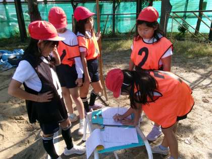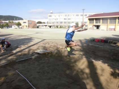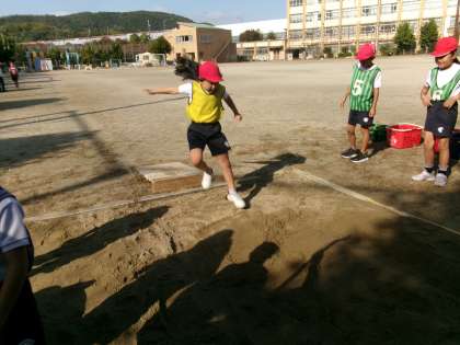 3年生では,走りはばとびの学習をしています。グループで役割を決め、ルールを守って活動していました。踏切板に向かって助走スピードをあげたり踏切位置を意識したりしながらとんでいる子もいました。いいところはどんどん真似をして、記録をのばせるようにがんばってほしいと思います。