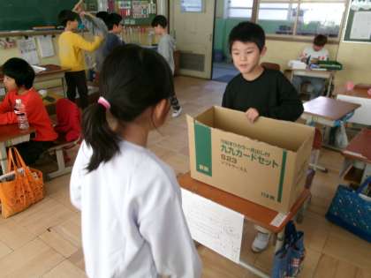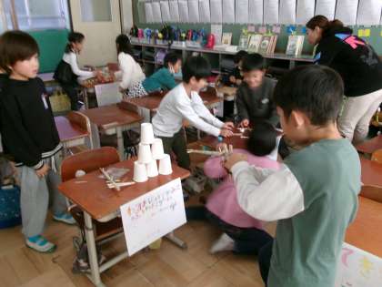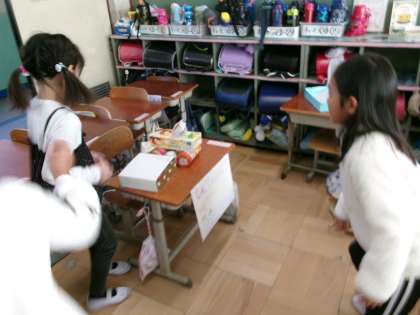 今日は、作ったおもちゃでお互いに遊び合いっこしました。楽しんでくれる友だちの様子を自慢げに見ている子どもたちの顔がなんともいえませんでした。